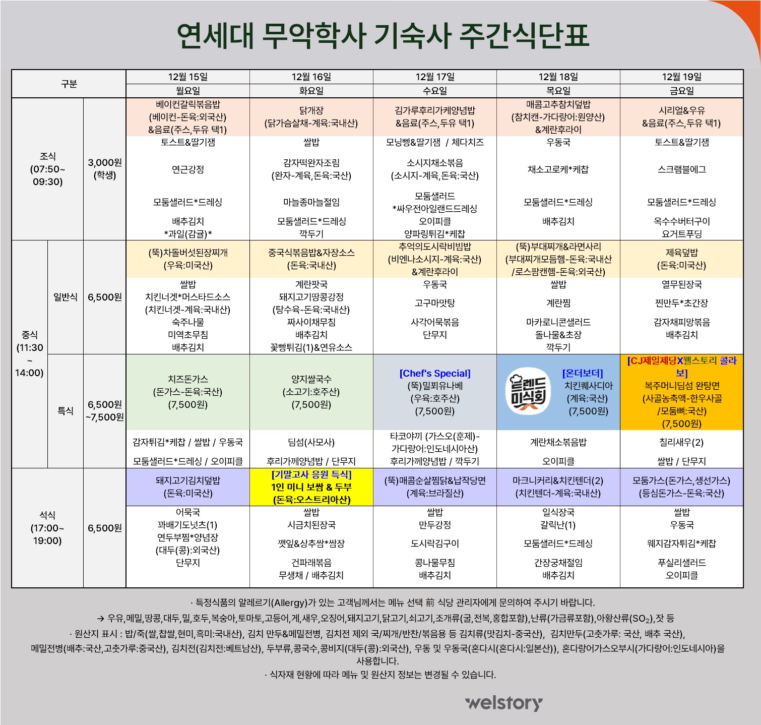 무악2학사 식당 주간식단표(12.15~12.19)
