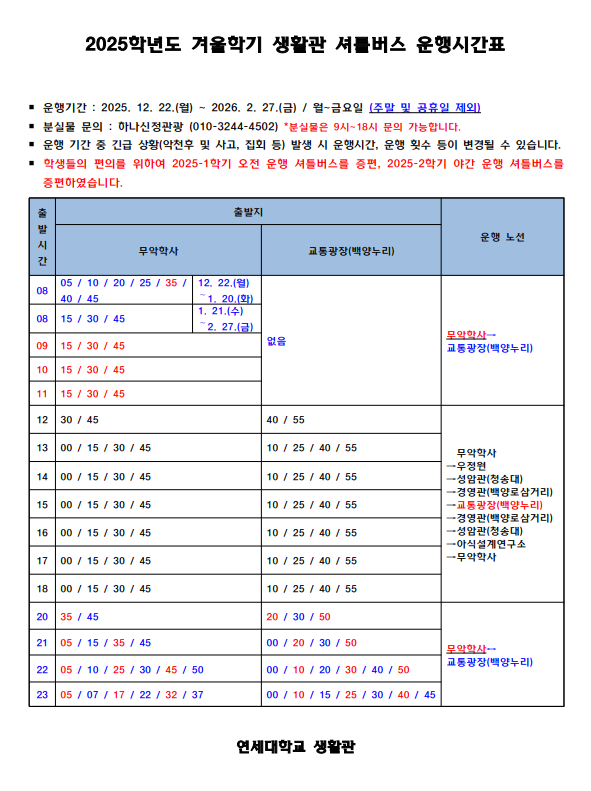 2025년 겨울학기 셔틀버스 시간표 (2025 Winter Semester Shuttle Bus Schedule)