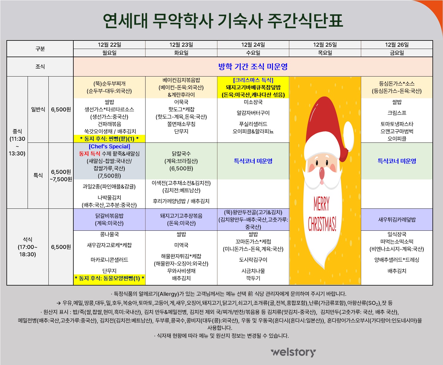 무악2학사 식당 주간식단표(12.22~12.26)