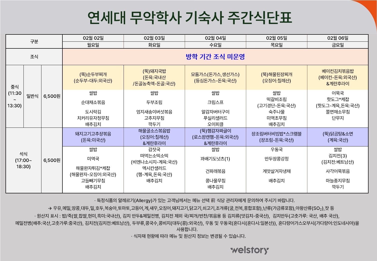 무악2학사 식당 주간식단표(2. 2.~2. 6.)