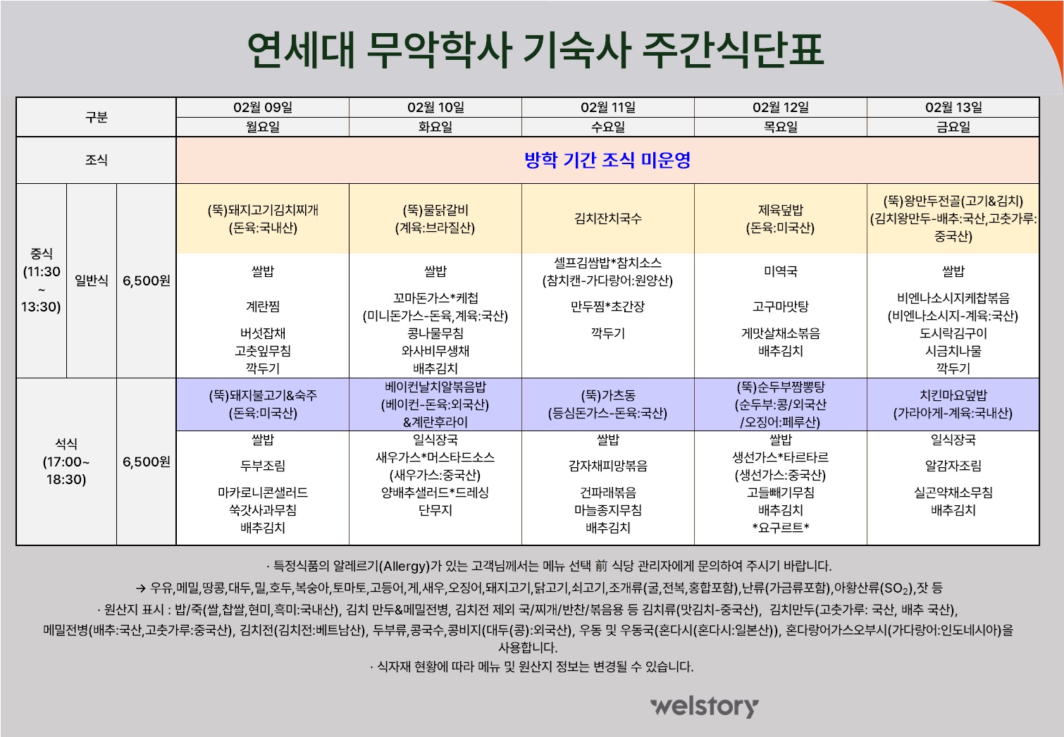 무악학사 식당 주간식단 (2026-2.9 ~ 2.13)