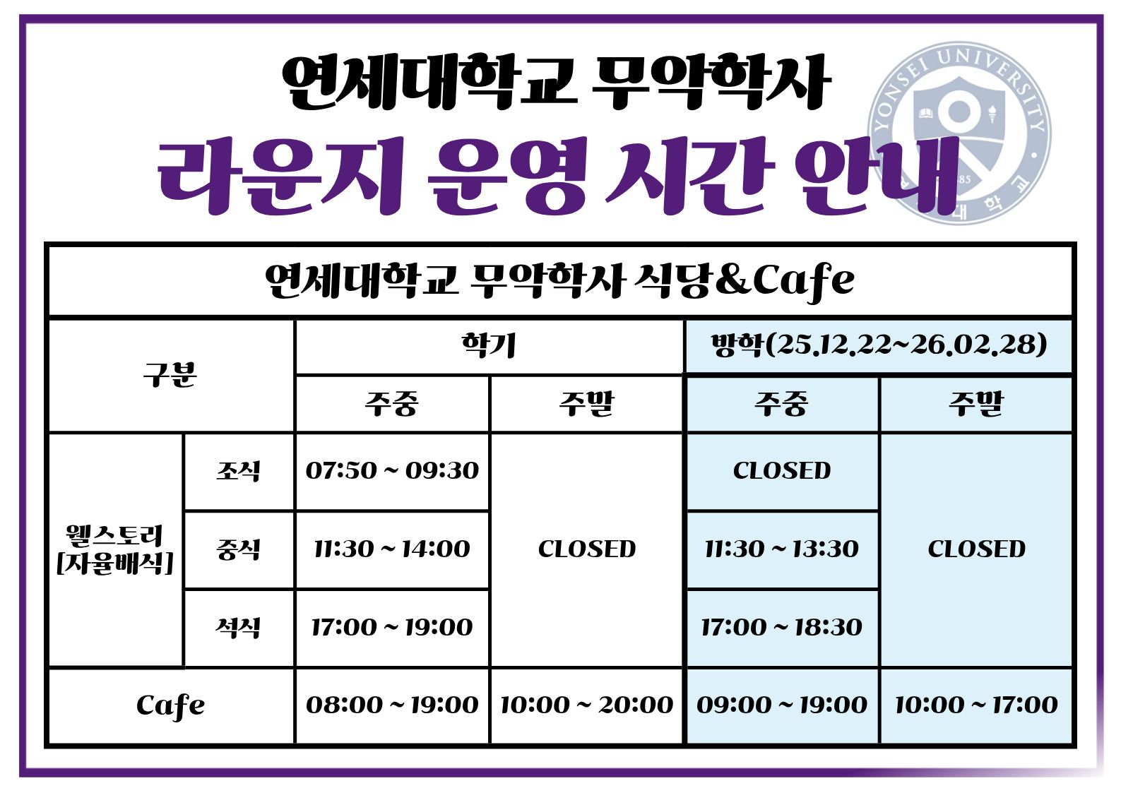 [재수정] 무악2학사 식당&카페 운영시간 안내(12.22~2.28)